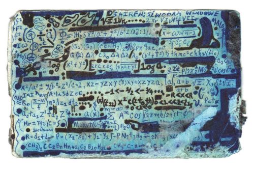 A lot of what Way portrays is derived from chemical notation; patterns of growth; chemical signatures for hydrogen bromide, ammonia, proto- and cytoplasms; compounds of nitrogen and hydrogen, amino acids, hydrocarbons, and protein chains; and in organized orders. Dots, dashes, parentheses, letters, or ellipses turn out to be his aesthetic version of deep sequencing, and add up to someone exploring the spaces between what is known and unknown, imagined, wished for, impossible, and written in visual language. It doesn’t matter to me if Way is copying these formulas or grabbing them from his involuting memory, or even if they’re mad. I will never understand what he’s saying any better than I understand what all the tens of thousands of unknown microbes on the edge of my cup are in relation to me, or what their life form might be. I take them and Way’s work as an indication that the vast part of knowledge, and even the knowable, is some sort of cosmic-psychic-molecular dark matter. It is there even if we can’t know it. The way knowing Vermeer is better than Norman Rockwell but never being able to prove it.